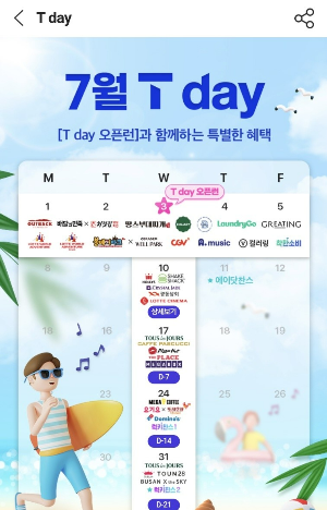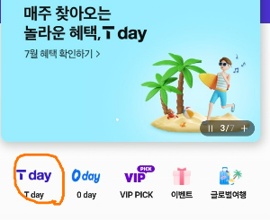 1. 먼저 T 멤버십 앱을 열고 T day를 클릭하고 스크롤을 쭉 내리면서 이번 주는 어떤 할인들이 있나 살펴보면서 롯데시네마 할인버튼을 찾습니다.