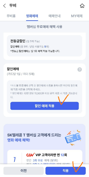 가고자 하는 위치의 영화관과 영화, 관람시간을 선택하고 좌석을 선택하고 나면 아래와 같이 할인을 적용해 주시면
